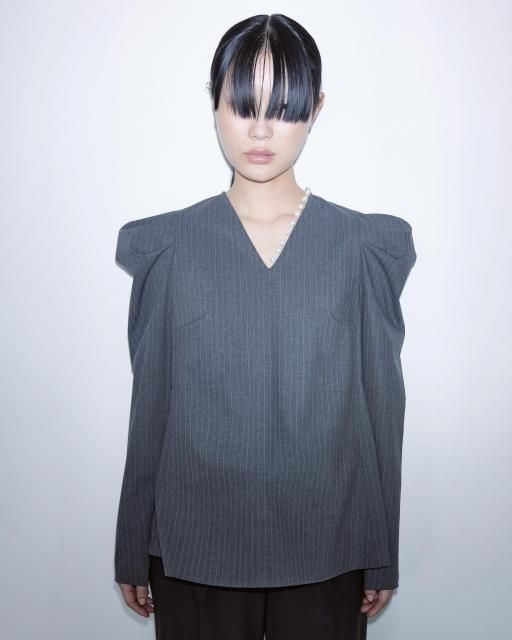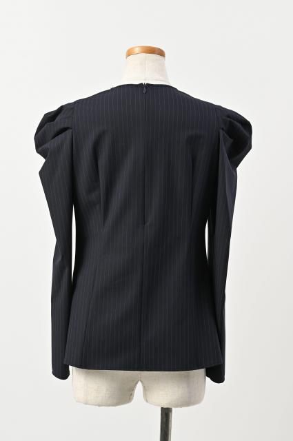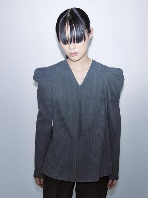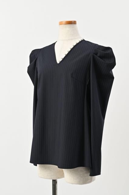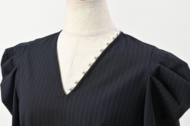 シャープな印象のピンストライプ柄に、パールディテールをあしらったブラウス。