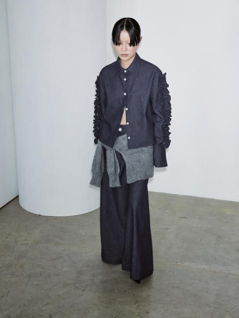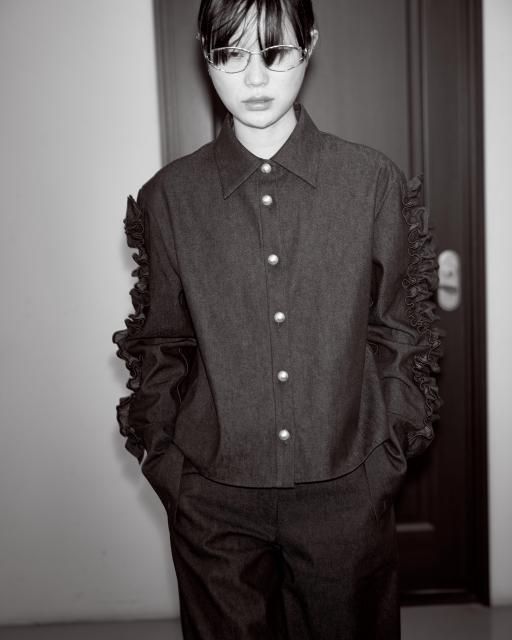 ショート丈のバランスと直線的なカッティングがモードなシルエットを引き立て、