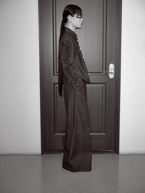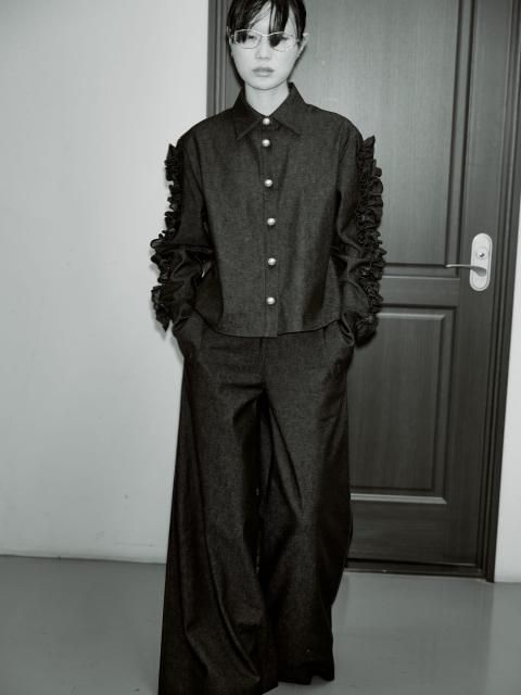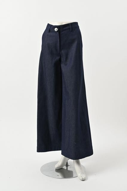 ノンウォッシュデニム素材を使用した、洗練された印象のワイドレッグパンツ。